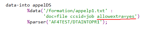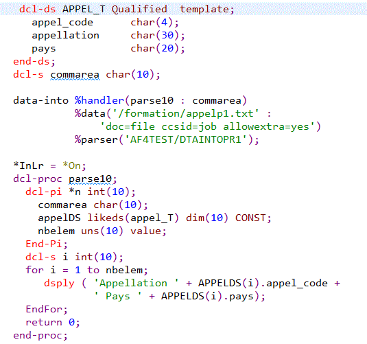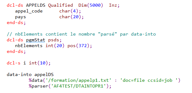 | data-into maDataStructure %data('Exemple.csv' : 'doc=file case=any ccsid=job ') %parser('*LIBL/MONPARSER'); |