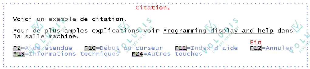 UIM gestion automatique d'attributs. :CIT. = définition d'une citation (automatiquement soulignée) :ECIT. = Fin de la citation. :HELP NAME = 'UIM/H9'.Citation. :XH3.Exemple de citation. :P. Voici un exemple de citation. :P. Pour de plus amples explications voir :CIT. Programming display and help :ECIT. dans la salle machine. :EHELP. |