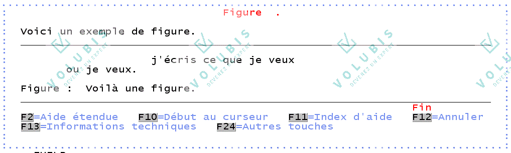 UIM gestion automatique d'attributs. :FIG. = définition d'une figure (automatiquement encadrée par deux lignes soulignées) :FIGCAP.= Texte associé à la figure :EFIG. = Fin de la figure. :HELP NAME = 'UIM/HA'.Figure . :XH3.Exemple de figure. :P. Voici un exemple de figure. :FIG. j'écris ce que je veux ou je veux. :FIGCAP. Voilà une figure. :EFIG. :EHELP. |