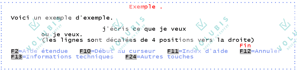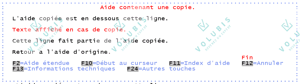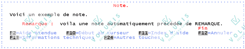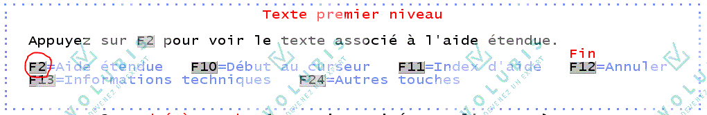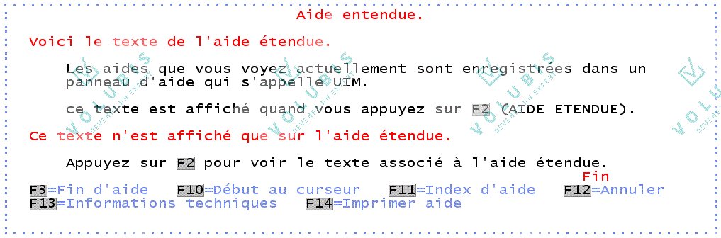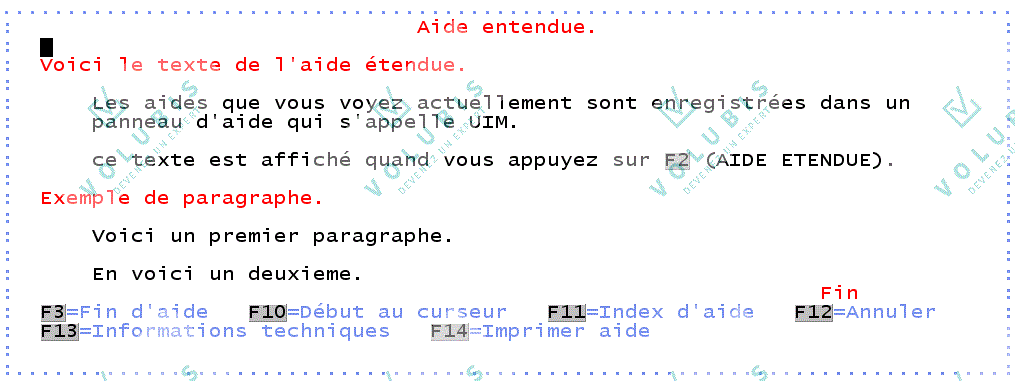 UIM gestion des entetes :Hn. = définition d'une entete. :XHn. = définition d'une entete (affichée uniquement sur l'aide étendue (via F2). ) OU n peut prendre les valeurs suivantes: 1 Texte centré (Haute intensité + soulignement) 2 Cadré à gauche (Haute intensité + soulignement) 3 Cadré à gauche (Haute intensité) 4 Cadré à gauche (soulignement) :HELP NAME = 'UIM/HD'.Texte premier niveau :XH3. Ce texte n'est affiché que sur l'aide étendue. :P. Appuyez sur F2 pour voir le texte associé à l'aide étendue. :EHELP. |