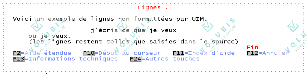 UIM Lignes non formattées. :LINES. = Début de lignes non formatées(affichées telles que saisies) :ELINES. = Fin de l'exemple. :HELP NAME = 'UIM/HL'.Lignes . :XH3.Exemple de lignes non formattées. :P. Voici un exemple de lignes non formattées par UIM. :LINES. j'écris ce que je veux ou je veux. (les lignes restent telles que saisies dans le source) :ELINES. :EHELP. |