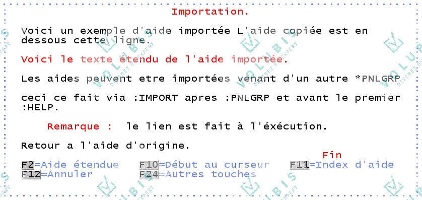 UIM Copie d'aide. :IMHELP NAME = 'HHHHHH' permet de demander l'exécution d'une autre aide dont le nom est HHHHH (si cet aide n'appartient pas au même PNLGRP il faudra utiliser au préalable le TAG :IMPORT.) :HELP NAME = 'UIM/HE' .Aide à copier :XH3.Texte affiché en cas de copie. :P. Cette ligne fait partie de l'aide copiée. :EHELP. :HELP NAME = 'UIM/HF'.Aide contenant une copie. :XH3.Exemple de copie d'aide. :P. L'aide copiée est en dessous cette ligne. :IMHELP NAME='UIM/HE'. :P. Retour à l'aide d'origine. :EHELP. |