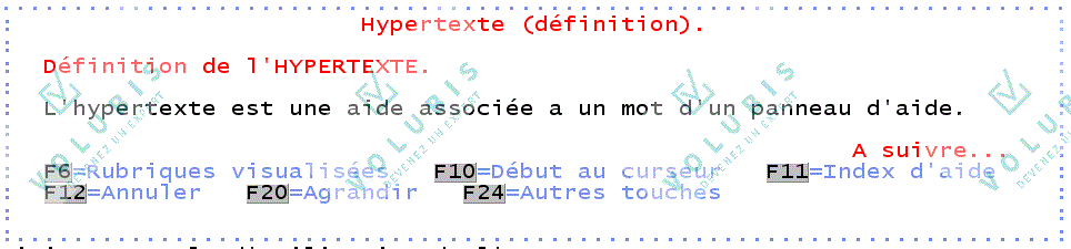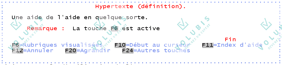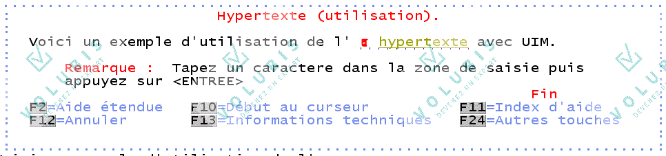 :HELP NAME = 'UIM/HG' .Hypertexte (définition). :XH3.Définition de l'HYPERTEXTE. :P. L'hypertexte est une aide associée à un mot d'un panneau d'aide. :P. Une aide de l'aide en quelque sorte. :NT.La touche F6 est active :ENT. :EHELP. :HELP NAME = 'UIM/HH'.Hypertexte (utilisation). :XH3.Utilisation de l'HYPERTEXTE. :P. Voici un exemple d'utilisation de l' :LINK PERFORM='DSPHELP UIM/HG'. hypertexte :ELINK. avec UIM. :NT.Tapez un caractere dans la zone de saisie puis appuyez sur <ENTREE> :ENT. :EHELP. |