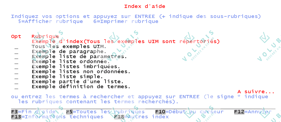 UIM Index de recherche Il est possible de prévoir des entrées d'index de recherche dans un panneau d'aide. :ISCH ROOTS='paragraphe'.Exemple de paragraphe. ou "paragraphe" est le mot "clé" associé à cet aide "Exemple de ..." le texte affiché par le pgm de recherche dans l'index (cde STRSCHIDX) quelques exemples: :HELP NAME = 'UIM/H2'.Liste de paramètres. :XH3.Exemple de liste de paramètres. :ISCH ROOTS='liste paramètre'.Exemple liste de parametres. ..... :HELP NAME = 'UIM/H4'.Listes ordonnées imbriquées. :XH3.Exemple listes ordonées imbriquées. :ISCH ROOTS='liste imbriquee'.Exemple listes imbriquées. ..... |