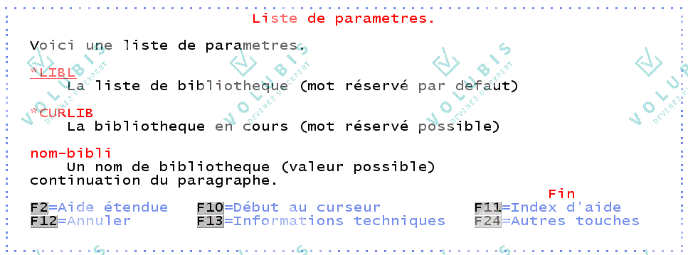 :HELP NAME = 'UIM/H2'.Liste de paramètres. :XH3.Exemple de liste de paramètres. :P. Voici une liste de paramètres. :PARML. :PT.:PK def. *LIBL :EPK. :PD. La liste de bibliothèque (mot réservé par défaut) :PT.:PK. *CURLIB :EPK. :PD. La bibliothèque en cours (mot réservé possible) :PT.:PV. nom-bibli :EPV. :PD. Un nom de bibliothèque (valeur possible) :EPARML. :PC.continuation du paragraphe. :EHELP. |