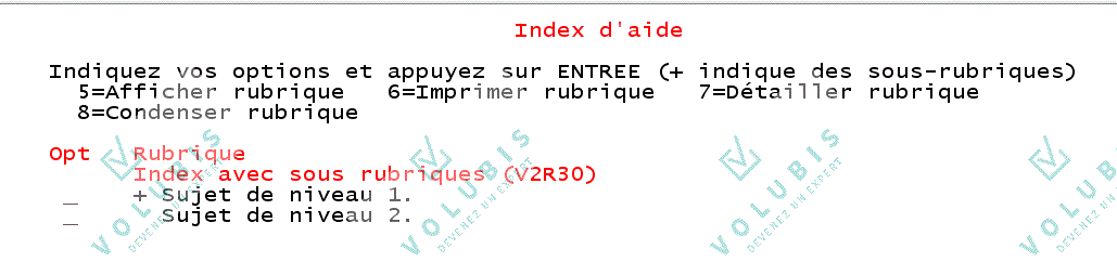 ATTENTION le lien entre l'index et le panel groupe est fait lors de l'exécution de la commande ADDSCHIDXE. SI vous modifiez les entrées (:ISCH) ou les synonymes (:ISCHSYN) il faut refaire ce lien: RMVSCHIDXE puis ADDSCHIDXE Depuis la V2R30 on peut organiser les sujets en ordre hiérarchique. sujet 1 sujet 11 --> sujet 11 est sous-rubrique de sujet 1 sujet 11a sujet 11b --> sujet 11a et 11b sont sous rubriques de sujet 11 sujet 12 sujet 12a etc ... sujet 2 |