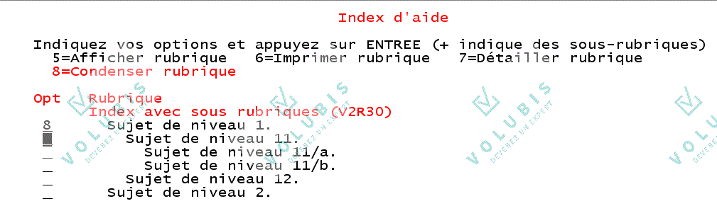 :HELP NAME = 'UIM/S11b' .Sujet 1-1/b. :ISCH ROOTS='sujet 11 b'.Sujet de niveau 11/b. :P.aide du sujet de niveau 1 sous rubrique 1/b :EHELP. :HELP NAME = 'UIM/S2' .Sujet 2. :ISCH ROOTS='sujet 2'.Sujet de niveau 2. :P.aide du sujet de niveau 2 :EHELP. Un panneau ne peut pas être indiqué plusieurs fois en tant que sous rubrique d'un même panneau : :ISCHSUBT topics='H1' topics='H1' est interdit Mais un panneau peut être sous rubrique de plusieurs panneaux différents La seule limite est le niveau d'imbriquation limité à 16 !! Tous les panneaux n'étant pas référencés en tant que sous rubrique sont considérés de premier niveau (un index sans sous rubrique ne contient que des panneaux de premier niveau = index avant V2R30) Vous allez visualiser un index contenant les panneaux ci-dessus : |