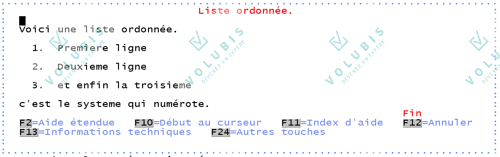 UIM gestion de listes. :OL. = Liste ordonnée(les éléments de la liste sont numérotés par UIM) :LI. = un élément de la liste. :EOL. = Fin de la liste numérotée. :HELP NAME = 'UIM/H3'.Liste ordonnée. :XH3.Exemple de liste ordonnée. :P. Voici une liste ordonnée. :OL. :LI. Premiere ligne :LI. Deuxieme ligne :LI. et enfin la troisieme :EOL. :P.c'est le système qui numérote. :EHELP. |