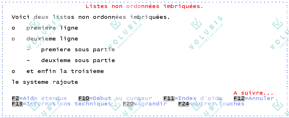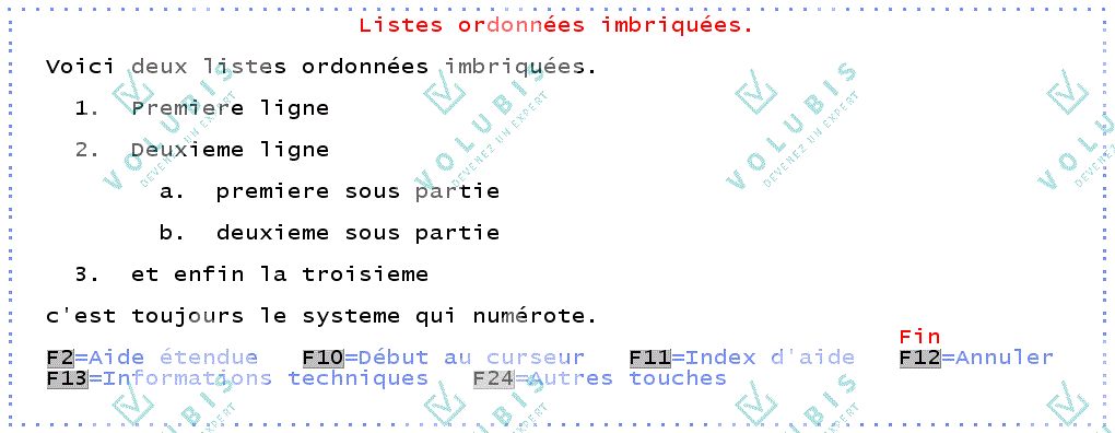 UIM gestion de listes (suite). Les listes ordonnées peuvent être imbriquées le marquage se fera alors avec une notion de lettre a,b,c,... :HELP NAME = 'UIM/H4'.Listes ordonnées imbriquées. :XH3.Exemple listes ordonnées imbriquées. :P. Voici deux listes ordonnées imbriquées. :OL. :LI. Premiere ligne :LI. Deuxieme ligne :OL. :LI. première sous partie :LI. deuxieme sous partie :EOL. :LI. et enfin la troisieme :EOL. :P.c'est toujours le système qui numérote. :EHELP. |