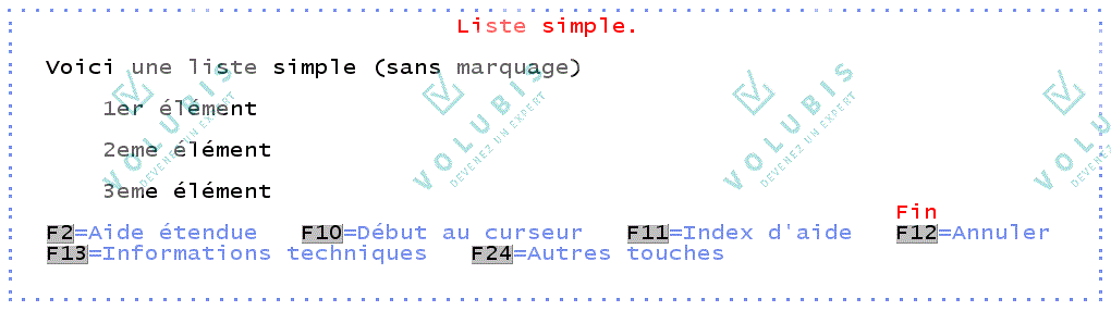 UIM gestion de listes (suite). :SL. = Liste simple. (éléments non marqués, non numérotés) :ESL. = Fin de liste simple. :HELP NAME = 'UIM/H6'.Liste simple. :XH3.Exemple de liste simple. :P. Voici une liste simple (sans marquage) :SL. :LI.1er élément :LI.2eme élément :LI.3eme élément :ESL. :EHELP. |