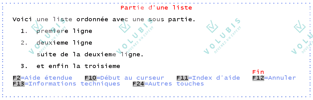 UIM gestion de listes (suite). :LP. = Partie d'une liste (suite d'un élément) Sans TAG de fin. :HELP NAME = 'UIM/H7'.Partie d'une liste :XH3.Exemple partie d'une liste. :P. Voici une liste ordonnée avec une sous partie. :OL. :LI.première ligne :LI.deuxieme ligne :LP. suite de la deuxieme ligne. :LI.et enfin la troisieme :EOL. :EHELP. |