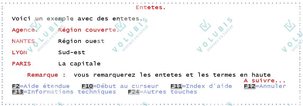 UIM définition de termes (gestion automatique d'entetes) :HELP NAME = 'UIM/H8'.Entetes. :XH3.Exemple de gestion automatique d'entetes. :P. Voici un exemple avec des entetes. :DL. :DTHD. Agence. :DDHD. Région couverte. :DT. NANTES :DD. Région ouest :DT. LYON :DD. Sud-est :DT. PARIS :DD. La capitale :EDL. :EHELP. |