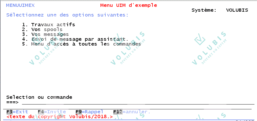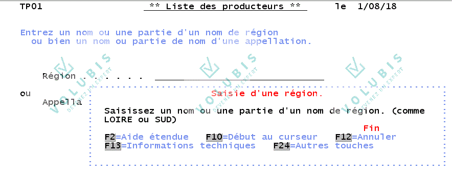 UIM gestion des entetes :Hn. = définition d'une entete. :XHn. = définition d'une entete (affichée uniquement sur l'aide étendue (via F2). ) OU n peut prendre les valeurs suivantes: 1 Texte centré (Haute intensité + soulignement) 2 Cadré à gauche (Haute intensité + soulignement) 3 Cadré à gauche (Haute intensité) 4 Cadré à gauche (soulignement) :HELP NAME = 'UIM/HD'.Texte premier niveau :XH3. Ce texte n'est affiché que sur l'aide étendue. :P. Appuyez sur F2 pour voir le texte associé à l'aide étendue. :EHELP. |