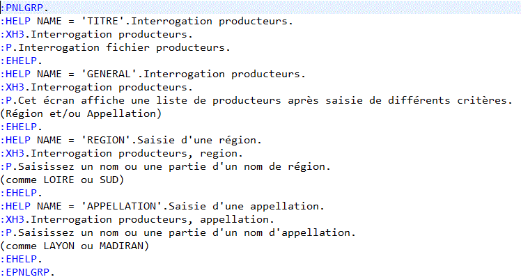 Regardons ensemble les principales étiquettes reconnues par UIM. :PNLGRP. première étiquette du source :EPNLGRP. derniere étiquette du source entre ces deux délimitateurs des aides commencant par :HELP NAME = 'nom-aide'.texte-de-l'aide. (WIDTH= ) (DEPTH= ) ... :EHELP. (sans paramètres) le nom de l'aide peut faire 32 caracteres,peut contenir un "/" doit être construit de la maniere suivante dans le cas d'une commande 'CCCCCC/PPPPP' ou CCCCCC est le nom de la cde PPPPPP le paramètre. WIDTH permet d'imposer une largeur de fenetre,DEPTH une hauteur :XH3. indique le texte à afficher avec l'aide étendue. |
