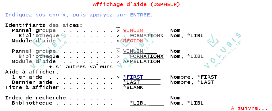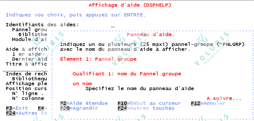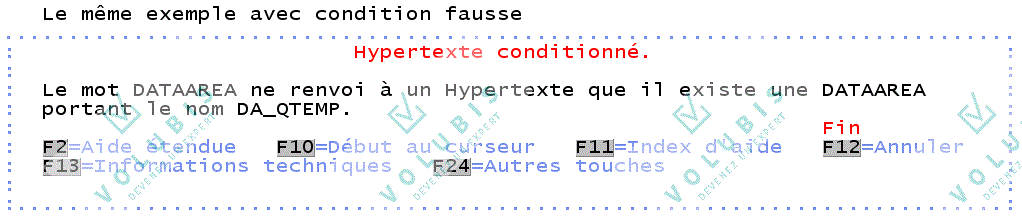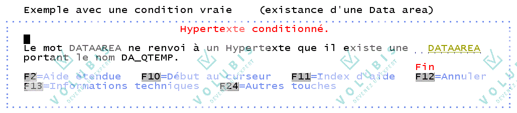 Le lien avec l'hypertexte peut être conditionné LINKWHEN 'condition' Il est possible d'associer plusieurs conditions à un "LINK". SYNTAXE COMPLETE: :LINK PERFORM='DSPHELP aide panel' (UNLESSx='conditionx' THENDOx='DSPHELP aide1 panel' (UNLESSy='conditiony' THENDOy='DSPHELP aide2 panel') ) (LINKWHEN='conditionz'). Le "LINK" n'est exécuté que si 'conditionz' est VRAIE si conditiony est vraie THENDOy est exécuté sinon si conditionx est vraie THENDOx est exécuté dans tous les autres cas le PERFORM initial est exécuté. |