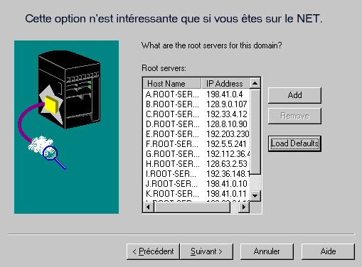 la norme DNS (Domaine name serveur) consiste à centraliser sur un serveur la correspondance adresse-ip/nom-de-machine pour un domaine. quand on demande www.ibm.com, votre navigateur demande aux serveurs de nom racines : 1/ l'adresse du serveur DNS pour .COM 2/ à celui ci, on demande l'adresse du serveur DNS IBM.COM 3 et enfin au serveur de domaine IBM.COM, l'adresse du HOST WWW. ce dialogue s'effectue en UDP sur le port 53. dans un domaine on peut avoir un serveur de "secours", on parle de serveur primaire de domaine et de serveur secondaire de domaine. un serveur peut être utilisé afin d'établir les correspondances nom / adresse, on parle alors de requêtes inverses. |