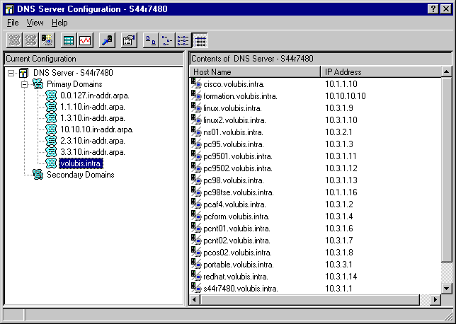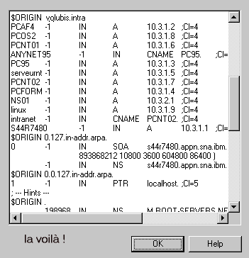 et enfin le contenu du fichier 10.in-addr.arpa pour les recherches inverses ; BIND version named %VERSION% BIND 4.9.3 ported onto AS400 ; from 10.3.1.5 at Mon Aug 31 09:09:12 1998 10 IN SOA serveurnt.volubis.intra. administrateur.volubis.intra. (5 3600 600 86400 3600 ) IN NS serveurnt.volubis.intra. $ORIGIN 1.3.10.in-addr.arpa. 1 IN PTR S44R7480.volubis.intra. 3 IN PTR PC95.volubis.intra. 4 IN PTR PCFORM.volubis.intra. 5 IN PTR serveurnt.volubis.intra. 6 IN PTR PCNT01.volubis.intra. 7 IN PTR PCNT02.volubis.intra. 9 IN PTR linux.volubis.intra. $ORIGIN 2.3.10.in-addr.arpa. 1 IN PTR NS01.volubis.intra. |