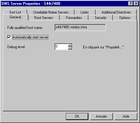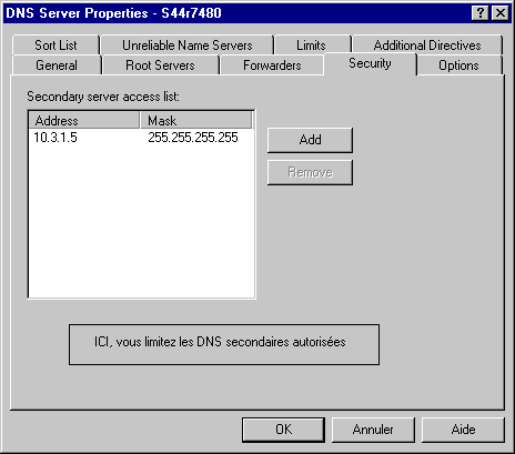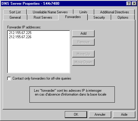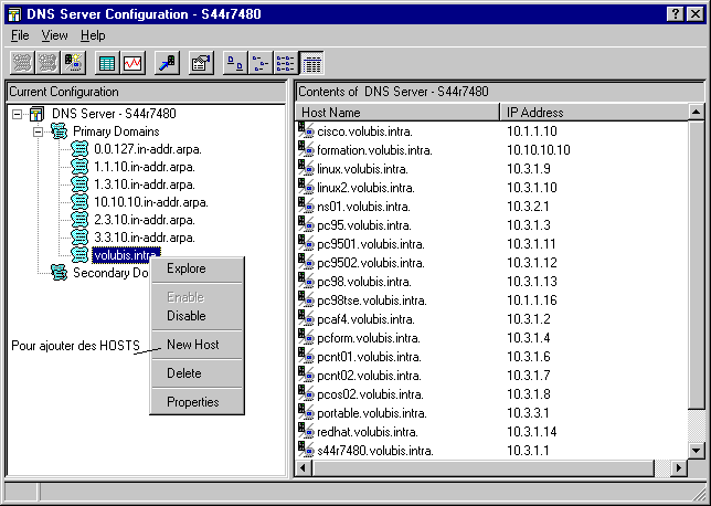 autres enregistrements : NS -> liste des serveurs DNS (primaires et secondaires) valides. par exemple , vous avez votre DNS primaire et votre fournisseur gère votre DNS secondaire : IN NS AS400.societe.fr IN NS www.fournisseur.fr A -> correspondance nom / adresse AS400 IN A 10.100.1.1 serveurNT IN A 10.100.1.2 etc... PTR -> correspondance inverse doit être indiquée dans le domaine 1.100.10.in-addr.arpa 1 IN PTR AS400.societe.fr 2 IN PTR serveurNT.societe.fr |