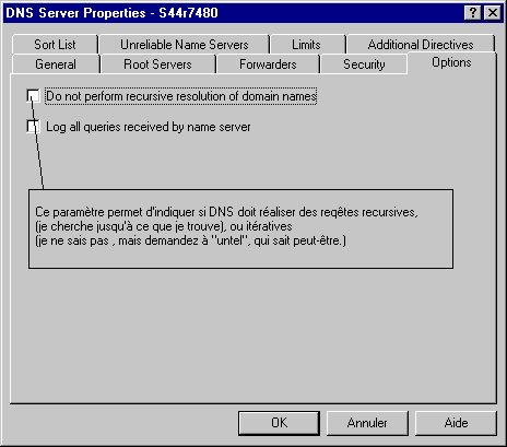 les clients du réseau interne doivent interroger la DNS interne les clients du bastion doivent AUSSI interroger la DNS interne afin de pouvoir référencer un host de votre réseau (mail par exemple) c'est la configuration (forwarder) qui va rerouter les requêtes vers l'exterieur. Autres recommendations ne rendez pas les enregistrements HINFO visibles de l'extérieur désactivez les transferts de zone pour tout le monde SAUF votre serveur secondaire (un pirate pourrait utiliser cette technique sinon) ATTENTION : Routez tous les messages entrants sur le bastion |