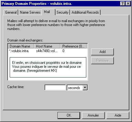 exemple : @ IN MX 10 mail.societe.fr IN MX 100 mail.fournisseur.fr as400 IN MX 10 mail.societe.fr * IN MX 10 mail.societe.fr les 2 premières lignes indiquent la machine mail comme serveur pour les messages user@societe.fr et le fournisseur si la machine mail est en panne la ligne 3 indique mail comme serveur pour les messages user@as400.societe.fr la ligne 5 indique mail comme serveur par defaut |