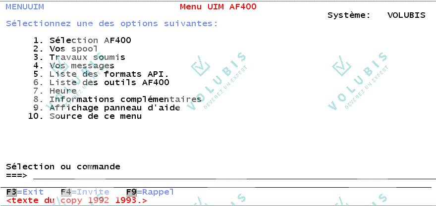 .* ------------------------------------------------------------------ * .* Option 1 $AID1 * .* -------------------------------------------------------------------* :HELP NAME='menu/option1'. Option 1 - Aide :XH3.Option 1. :P. Sélection AF400 :EHELP. .* ------------------------------------------------------------------ * .* Option 2 $AID2 * .* -------------------------------------------------------------------* :HELP NAME='menu/option2'. Option 2 - Aide :XH3.Option 2. :P. Voir vos spool :EHELP. .* ------------------------------------------------------------------ * .* Option 3 $AID3 * .* -------------------------------------------------------------------* :HELP NAME='menu/option3'. Option 3 - Aide :XH3.Option 3. :P. Travaux soumis. :EHELP. .* ------------------------------------------------------------------ * .* Option 4 $AID4 * .* -------------------------------------------------------------------* :HELP NAME='menu/option4'. Option 4 - Aide :XH3.Option 4. :P. Voir vos messages :EHELP. .* ------------------------------------------------------------------ * .* Option 5 $AID5 * .* -------------------------------------------------------------------* :HELP NAME='menu/option5'. Option 5 - Aide :XH3.Option 5. :P. Liste formats des structures API |