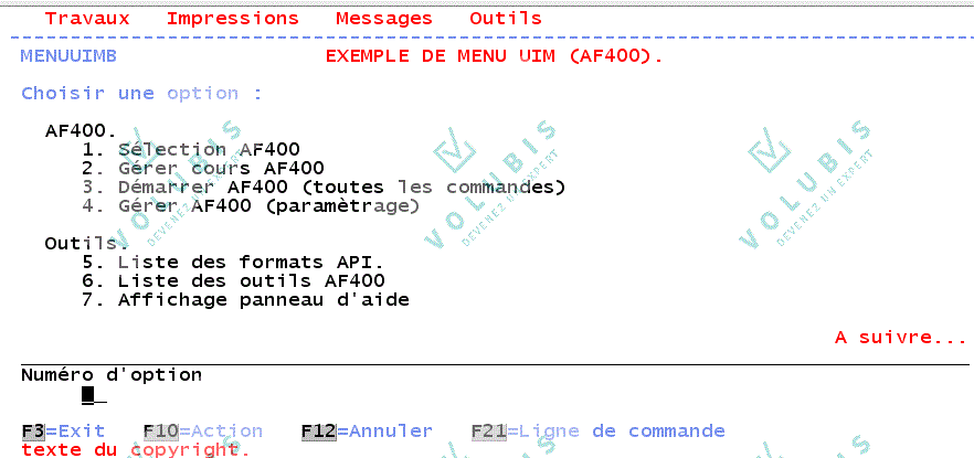 ACTION=CMDLINE VARUPD=no.F21=Ligne de commande :KEYI KEY=ENTER HELP=ENTERaide ACTION=ENTER. :KEYI KEY=HELP HELP=HELPaide ACTION=HELP. :KEYI KEY=PAGEDOWN HELP=PDWaide ACTION=PAGEDOWN. :KEYI KEY=PAGEUP HELP=PUPaide ACTION=PAGEUP. :EKEYL. :PANEL NAME=GENERAL HELP='GENERAL/aide' KEYL=listecles MBAR=MBARLNK TOPSEP=SPACE PANELID=ZMENU ENTER='MSG CPD9817 QCPFMSG'. EXEMPLE DE MENU UIM (AF400).   :MENU DEPTH='*' SCROLL=YES BOTSEP=RULE. :TOPINST.Choisir une option :   .* ------------------------------------------------------------------ * .* * .* Action éffectué par chaque OPTION * .* * .* -------------------------------------------------------------------* :MENUGRP.AF400. .* ------------------------------------------------------------------ * .* Option 1 $OPT1 * .* -------------------------------------------------------------------* :MENUI OPTION=1 ACTION='CMD SLTAF4' HELP='menu/option1'. Sélection AF400 .* ------------------------------------------------------------------ * .* Option 2 $OPT2 * |
