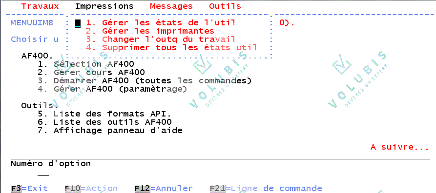 :XH3.Changer de session :P. Cette option permet de changer session ou d'en ouvrir une deuxième, attention une seule session sera active à la fois :EHELP. :HELP NAME='MENUBAR/IMPRESSION'.Impressions- aide :XH3.Impressions :P. Cette barre d'option vous permet de gérer vos impressions :EHELP. :HELP NAME='MENUBAR/SPOOL'.Spool - aide :XH3.Spools :P. Cette option vous permet de gérer vos états en attente d'impressions, si vos états ne servent plus supprimez les. :EHELP. :HELP NAME='MENUBAR/IMPRIMANTE'.Imprimante - aide :XH3.Imprimantes :P. Cette option vous permet de gérer l'état des imprimantes du systèmes :EHELP. :HELP NAME='MENUBAR/OUTQ'.Outq - aide :XH3.Outq :P. Cette option vous permet de changer l'outq du travail en cours, les impressions que vous effectuerer seront palcée dans cette file. :EHELP. :HELP NAME='MENUBAR/SPOOLS'.Suppression des spools - aide :XH3.Suppression des Spools :P. Cette option vous permet d'éffacer tous les spools de votre profil utilisateur :EHELP. :HELP NAME='MENUBAR/MESSAGE'.Messages - aide :XH3.Messages :P. Cette barre d'options vous permet de gérer vos messages. :EHELP. :HELP NAME='MENUBAR/ECRAN'.Messages écran - aide :XH3.Messages écran :P. Cette option vous permet de gérer vos messages écran. :EHELP. :HELP NAME='MENUBAR/UTILISATEUR'.Messages utilisateur - aide |