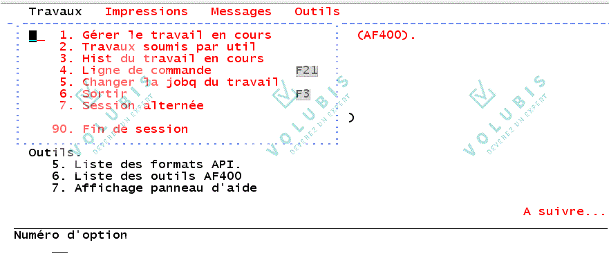 :EHELP. .* ------------------------------------------------------------------ * .* Option 90 $AID90 * .* -------------------------------------------------------------------* :HELP NAME='option90'.Option90 - aide :XH3.Option 90 :P. Cette option vous permet de quitter le système et de revenir sur l' écran d'ouverture. :EHELP. .* ------------------------------------------------------------------ * .* Aides barre d'action * .* -------------------------------------------------------------------* :HELP NAME='MENUBAR/TRAVAUX'.Travaux - aide :XH3.Travaux :P. Cette barre d'option vous permet de gérer vos travaux. :EHELP.   :HELP NAME='MENUBAR/TRAVAIL'.Gérer votre travail - aide :XH3.Gérer votre travail :P. Cette option permet de gérer les attributs du travail en cours :EHELP. :HELP NAME='MENUBAR/SOUMIS'.Gérer les travaux soumis - aide :XH3.Gérer les travaux soumis :P. Cette option permet de gérer les travaux lancer en batch par votre profil utilisateur :EHELP. :HELP NAME='MENUBAR/HISTORIQUE'.Historique du travail - aide :XH3.Historique du travail :P. Cette option permet d'afficher l'historique du travail en cours, si vous désirez sauvegarder cet historique sorter par l'option 90 et remplacer *NOLIST Par *LIST. :EHELP. :HELP NAME='MENUBAR/JOBQ'.Changer de jobq - aide :XH3.Changer de jobq :P. Cette option permet de changer la jobq du travail en cours les travaux que vous allez soumettre seront placés dans cette file. :EHELP. :HELP NAME='MENUBAR/SECJOB'.Changer de session - aide |