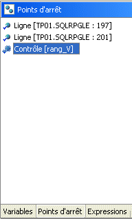 Une fois vos points d'arrêt posés, vous pourrez les voir dans la fenêtre en haut à droite, vue Points d'arrêt.
